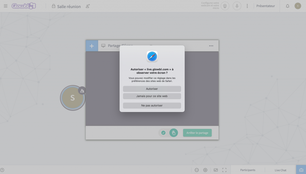 Si vous utilisez Safari, cliquez simplement sur “Autoriser” lors de l’activation de la webcam par exemple.