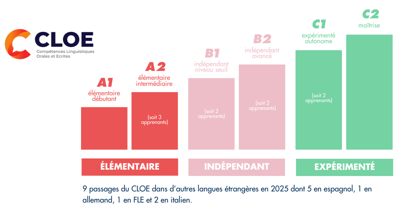 Taux de réussite pour d’autres langues enseignées : l’espagnol : 100%, l’italien : 100%, le français (FLE) : 100% et l’allemand : 100%.